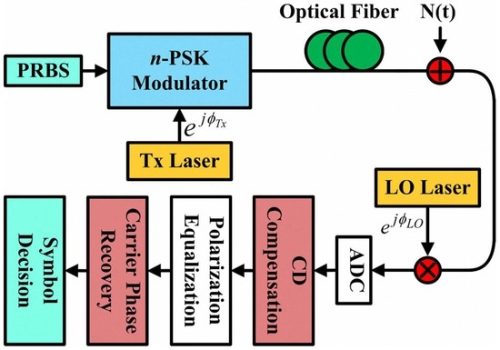 In previous reports, the analytical derivations and numerical studies for the one-tap normalized LMS, block-wise average, and Viterbi-Viterbi carrier phase recovery methods have been carried out based on the quadrature phase shift keying (QPSK) coherent optical transmission system [26,37,51]. However, with the development of the optical fiber networks and the increment of transmission data capacity, the QPSK modulation format can no longer satisfy the demand for high-speed optical fiber communication systems. Therefore, the analyses on the carrier phase recovery approaches should also be updated accordingly for the optical fiber transmission systems using higher-level modulation formats, such as the n-PSK communication systems.