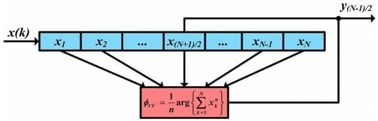 As another n-th power feed-forward carrier phase recovery approach, which is schematically shown in Figure 4, the Viterbi-Viterbi algorithm also calculates the n-th power of the received symbols to remove the information of the modulated phase. The computed phase data are also summed and averaged over the processing block (with a certain block length). Compared to the block-wise average algorithm, the Viterbi-Viterbi algorithm just treats the extracted phase as the estimated phase for the central symbol in each processing block [31,32]. The estimated carrier phase in the Viterbi-Viterbi algorithm in the n-PSK coherent optical transmission systems can be described using the following equation:
