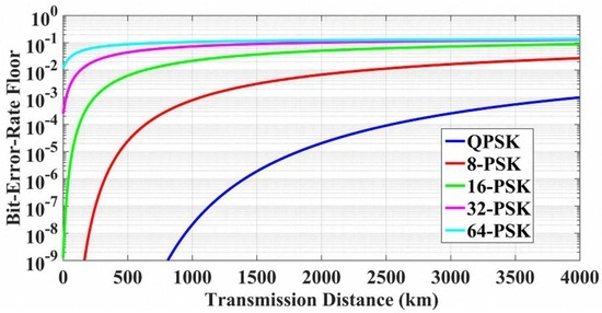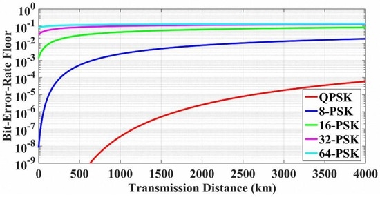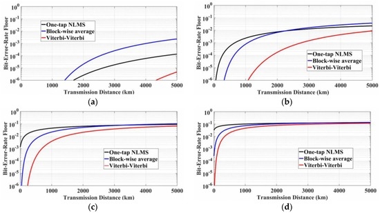 As shown in Figure 13, the BER floors of the Viterbi-Viterbi carrier phase recovery have also been investigated for different transmission distances considering the impact of EEPN, where the linewidths of the Tx and the LO lasers are both set to 1 MHz. It can be found that in the Viterbi-Viterbi carrier phase recovery, the EEPN influence will also increase with the increment of transmission distances and modulation formats. The performance of the Viterbi-Viterbi algorithm is degraded significantly with the increment of transmission distances, and this effect is more serious for higher-level modulation formats.
