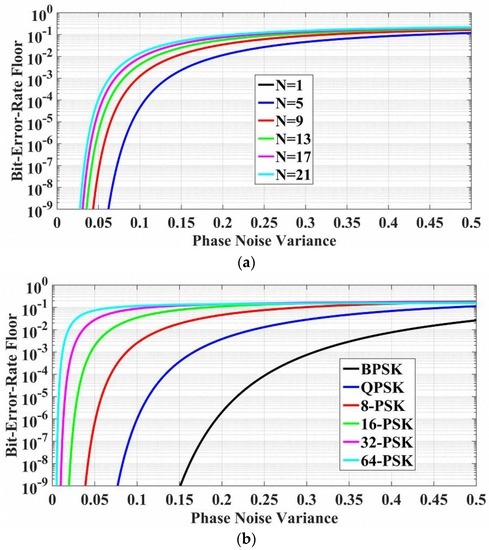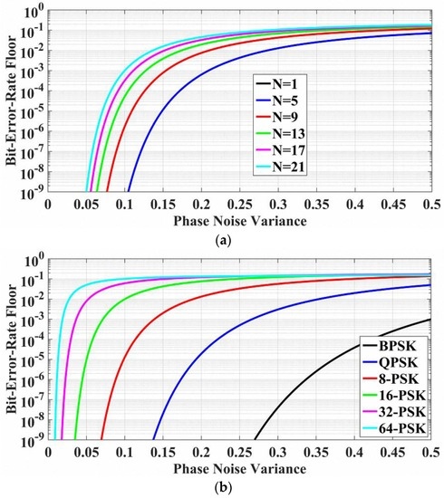 The performance of the block-wise average carrier phase recovery approach has also been investigated, as shown in Figure 8, Figure 9 and Figure 10. The BER floors versus different phase noise variances (or effective phase noise variance) in the block-wise average carrier phase recovery is described in Figure 8. In Figure 8a, the performance of the block-wise average algorithm is studied in terms of different block lengths in the 8-PSK optical transmission system. It can be found that the phase noise (or effective phase noise) induced BER floor in the block-wise average carrier phase recovery algorithm is increased with the increment of block length. Generally, a smaller block length will lead to a lower phase noise induced BER floor due to a more accurate estimation of carrier phase, while a larger block length is more effective for mitigating the amplitude noise (such as the amplified spontaneous emission—ASE—noise) to improve the SNR sensitivity. In practical transmission systems, the optimal block length is determined by considering the trade-off between the phase noise and the amplitude noise. As an example, the block length of NBWA = 11 is employed in all subsequent analyses, if the value is not specified. Based on Equations (12) and (13), the performance of the block-wise average carrier phase recovery in the coherent optical communication systems using different modulation formats is shown in Figure 8b, where the block length is 11. It can be found in Figure 8b that the block-wise average carrier phase recovery algorithm is also very sensitive to the phase noise variance and the modulation formats, when phase noise variance is less than 0.1.