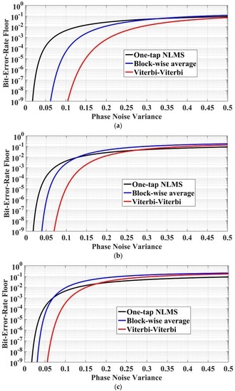 The comparisons of the one-tap normalized LMS, the block-wise average, and the Viterbi-Viterbi carrier phase recovery algorithms have also been investigated in detail. The BER floors versus different phase noise variances in the above three carrier phase recovery algorithms in the 8-PSK optical fiber communication system have been studied and are shown in Figure 14, where the block length in the block-wise average and the Viterbi-Viterbi algorithms varies from 5 to 17, in Figure 14a–c, respectively. It can be seen that the phase noise induced BER floors in the block-wise average and Viterbi-Viterbi algorithms are degraded with increment of the block length, and the one-tap normalized LMS algorithm keeps the same performance due to its optimized operation. It is also found in Figure 14 that for the small phase noise variance (or effective phase noise variance), the Viterbi-Viterbi carrier phase recovery algorithm outperforms the one-tap normalized LMS and the block-wise average algorithms, while for the large phase noise variance (or effective phase noise variance), the one-tap normalized LMS algorithm shows a better performance than the other two algorithms in the carrier phase recovery.