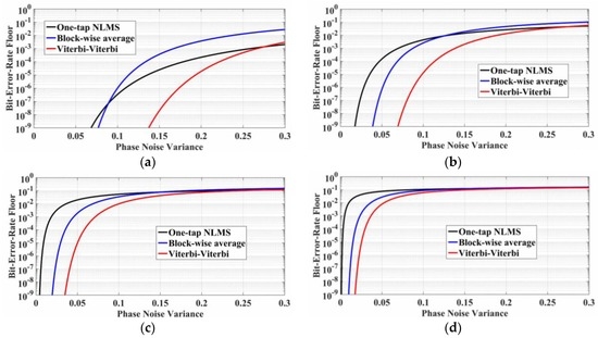 Based on Equation (9), the performance of the one-tap normalized LMS carrier phase recovery in the coherent optical fiber communication systems using different modulation formats is shown in Figure 5. The optimization of the one-tap normalized LMS carrier phase recovery has been investigated and discussed in detail in Reference [27,37], where the step size varying from 0.01 to 1 has been applied. A smaller step size will degrade the BER floor due to the fast phase changing occurring in the long effective symbol average-span, while a larger step size will degrade the signal-to-noise ratio (SNR) sensitivity in the one-tap normalized LMS carrier phase recovery. The optimal step sizes for different effective linewidths have been studied, with a resolution of 0.005 used in the optimization process [37]. In this section we assume that all the operations of the one-tap normalized LMS algorithm have been optimized. It can be found in Figure 5 that the one-tap normalized LMS carrier phase recovery algorithm is very sensitive to the phase noise variance and the modulation formats, especially when phase noise variance is less than 0.1.