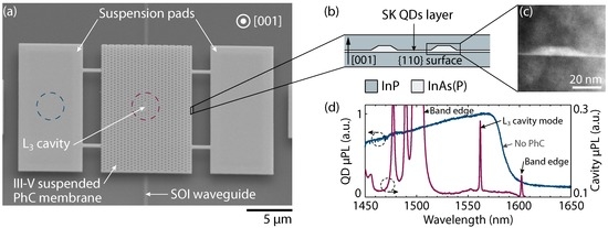 The device consisting of a 2D PhC lattice etched into a thin InP membrane and embedding a defect PhC cavity is shown in Figure 1a. The membrane is suspended with four bridges, connected to suspension pads at two sides, over a SOI waveguide in order to achieve a deterministic evanescent coupling of the guided light to and from the embedded cavity (Figure 1a). For full details on PhC structure design and the device fabrication procedure, see Materials and Methods. A layer of Stranski Krastanov QDs is incorporated in the centre of the membrane as the embedded light emitters (Figure 1b,c). Such InAs(P) QDs are suited for efficient non-resonant pumping below the InP gap with subsequent broadband emission in the near infrared range (Figure 1d). The PL spectrum of these QDs, filtered by the PhC cavity, provides information on the characteristics of the fabricated devices. For this purpose, we perform PL measurements by non-resonantly pumping the QDs with a continuous wave (CW) laser ( nm). Emission from the PhC cavity is collected with a spectrograph (resolution 0.8–0.9 nm). Typical PL spectra, demonstrating the QD emission from an unpatterned area of the sample and from an cavity, are displayed in Figure 1d. Pronounced peaks corresponding to band edge and cavity modes are well visible. The position of the excitation spot (typical size 3 m) is indicated in Figure 1a. We notice a decrease of the loaded optical Q of the cavity by about about a factor of 10 due to the evanescent coupling to the SOI waveguide.