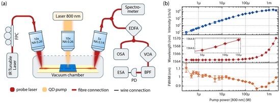 (a) Schematic of the experimental set-up for the characterization of optical/optomechanical transduction of non-resonant pump ( nm) to resonant probe ( m); (b) Emission properties of the QDs, filtered by the cavity (loaded nm): fitted intensity I, wavelength and linewidth κ of the collected emission are plotted versus non-resonant pump power. Inset: zoom-in of power dependence.