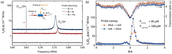 The noise spectra of the transmitted probe light, coupled to the defect PhC cavity resonance, at different laser-cavity detunings Δ and close to the fundamental mode frequency of the membrane Brownian motion consists of two resonance peaks (Figure 3a): one corresponding to the fundamental mechanical mode () at and another related to the modulation frequency of the non-resonant pump laser. For the mechanical mode at we observe the optical spring effect: the mechanical mode amplitude , linewidth and frequency are modified when the laser probe is swept across the cavity optical resonance [6]. Concerning the modulation peak, it does not come from direct modulation of the probe laser carrier, but is transferred to it via the QD layer. The modulation of the QD absorption creates photons at which are filtered by the cavity and coupled to the waveguide at the probed wavelength. The incident power of the non-resonant pump in our experiments did not exceed 250 W (Figure 2b), to avoid possible concomitant thermal effects whose relaxation time is of the order of 1 s [18].