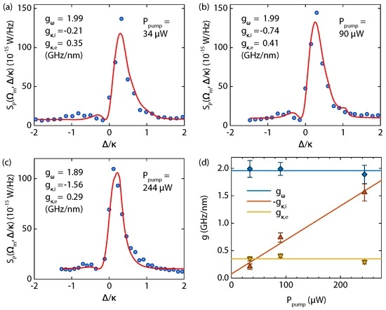 (a–c) Power spectral densities at mechanical resonance (circles: experimental data; solid lines: fit to model [6]) and fitted relative contributions of coupling dispersive () and dissipative (intrinsic and external ) coupling strengths for different powers of non-resonant pump; (d) Experimental evolution of the optomechanical coupling coefficients with the power of the external non-resonant pump (markers—data from (a–c), solid lines—linear fits).