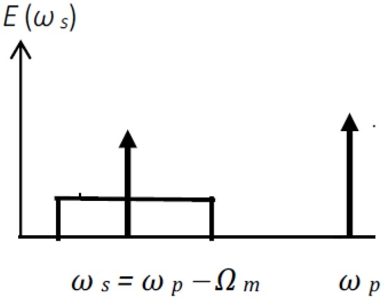 An electro-optic phase-sensitive amplifier (EO-PSA) will consist of an electro-optic waveguide with electrodes designed for traveling microwave modulating signals. By adjusting the phases of the microwave field and of the optical pump wave, a frequency downshifted input signal can be amplified or attenuated [7] as illustrated in Figure 2. An optical pump with a narrow spectral bandwidth can amplify and filter out a similarly narrow signal bandwidth through the EOP process of frequency translation [7,27]. The frequency downshifting ωp − Ωm = ωs would be easy to implement because it generates microwave photons, requiring only a limited level of input microwave power. Broadband amplification with EOP devices is possible by operating multiple optical pump waves.