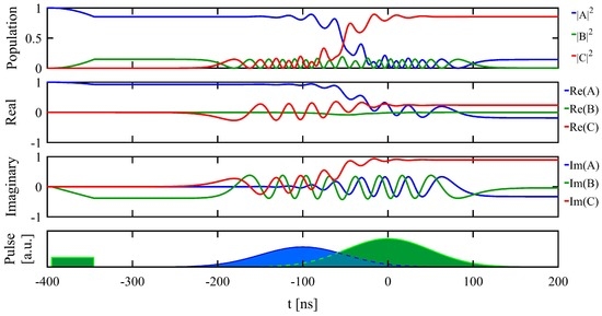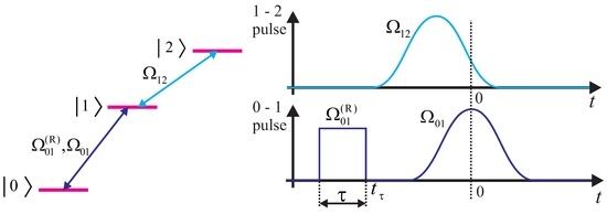 Using multi-level quantum systems instead of the commonly employed two level qubits extends the Hilbert space of the system, which in turn would reduce the number of elements needed to perform a given computational task [1,2,3]. However, this advantage comes at the cost of increased requirements for the accuracy of the control pulses used to manipulate the states of the system. A key operation in quantum computation is the efficient and robust preparation of the initial state, which serves as a starting point of quantum algorithms. For example, in a two-level system the application of a π-pulse switches the qubit from the ground state to the first excited state, and any superposition can be easily created by applying Rabi pulses with appropriate length and amplitude. The task becomes more complicated if we intend to control a system with three states , , and because some of the transitions might be forbidden due to selection rules. In this case, one has to transfer the population in some other way. A simple approach would be to apply a sequence of pulses, first a pulse followed by a pulse: however, this sequence will be quite sensitive to the timing and the amplitude of the pulses. This makes the generation of such a sequence an experimentally demanding task—in general susceptible to environmental fluctuations and instrumentation errors.