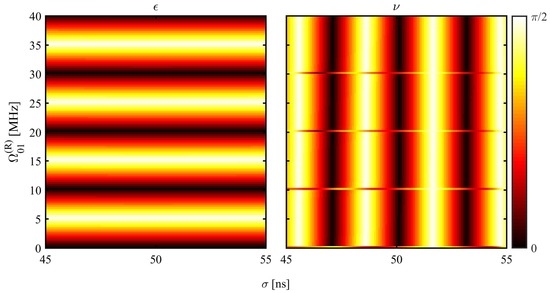 The magnitude of the wavefunction coefficients in spherical coordinates, ϵ and ν, as a function of the Rabi pulse amplitude and the duration of the STIRAP pulses σ. The horizontal lines in the right plot result from the numerical instability when and ν is undefined. The parameters of the simulation are , , MHz, , and ns. The simulation agrees with the adiabatic-approximation analytical result Equation (13).