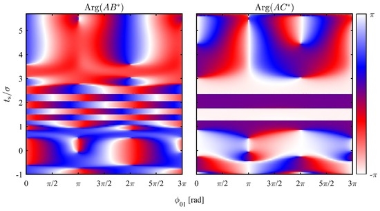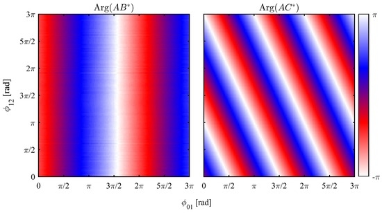 The relative phases between the complex amplitudes A, B, and C of the qutrit as a function of the dimensionless STIRAP pulse separation and the STIRAP phases and . The STIRAP phases are changed so that . When the adiabatic condition is met, the relative phases are given by Equations (20) and (21), resulting in the formation of a stripe structure. The abrupt π phase shifts across the stripes are due to the changes of sign of the amplitudes, as can be seen from the sin and cos terms of Equation (13). The parameters for the simulation are MHz, ns, , and .