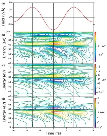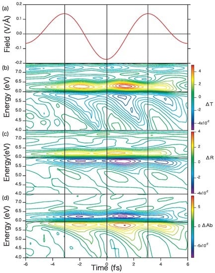 - Schultze, M.; Ramasesha, K.; Pemmaraju, C.D.; Sato, S.A.; Whitmore, D.; Gandman, A.; Prell, J.S.; Borja, L.J.; Prendergast, D.; Yabana, K.; et al. Attosecond band-gap dynamics in silicon. Science 2014, 346, 1348–1352. [Google Scholar] [CrossRef] [PubMed]