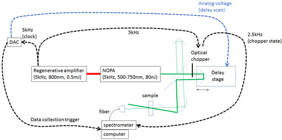 - Yabushita, A.; Kao, C.-H.; Lee, Y.-H.; Kobayashi, T. Development and demonstration of table-top synchronized fast-scan femtosecond time-resolved spectroscopy system by single-shot scan photo detector array. Jpn. J. Appl. Phys. 2015, 54, 072401. [Google Scholar] [CrossRef]
