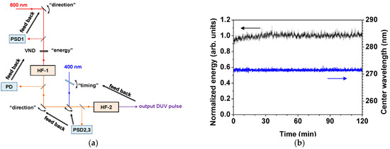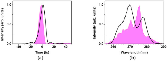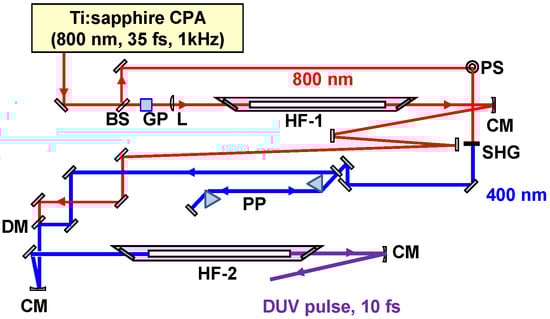 - Kida, Y.; Okamura, K.; Liu, J.; Kobayashi, T. Sub-10-fs deep-ultraviolet light source with stable power and spectrum. Appl. Opt. 2012, 51, 6403–6410. [Google Scholar] [CrossRef] [PubMed]