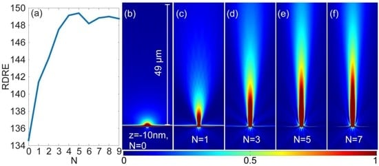 (a) RDREair and (b–f) |E|2 vs. the number of grooves N for a BE with r1 = 555 nm, P = 590 nm, w1 = 130 nm and wp = 210 nm, wa = 30 nm and t = 110 nm, on a diamond substrate with NV- at (xd, zd) = (0, −10) nm, emitting at λ = 700 nm.