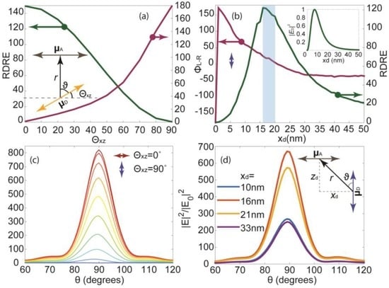 For a horizontally oriented µD, field amplitude of the donor projected over the aperture vs. xd was calculated analytically using Equation (3) with sin ϑ = |zd|/r, see Figure 7a. The trend observed in |ED|2(x=0,z=0) spectrum agrees with that of the RDREair obtained numerically, Figure 7b. Numerical results revealed that the device tolerates a lateral displacement of Δxd ≈ ±15 nm beyond which the RDREair drops below 1/e of its maximum. The phase difference ΔΦL−R in this case rises at xd ≥ 7 nm, reaching a maximum of ~105° at xd = 23 nm but never attaining a 180° difference to qualify Ex as a pure odd function. RDREair, on the other hand, drops to 1/e of it maximum at xd ≈ 15 nm where ΔΦL−R is 70°. Defining the state of even function-ness as cos2(ΔΦL−R/2), a 70° phase difference must drop the RDREair only to 0.67 (not 1/e) of its maximum. The 55% excess reduction, therefore, is partially due to the Ex not being a pure even function and partially due the reduction in |ED|2(x=0,z=0) with increase in xd.