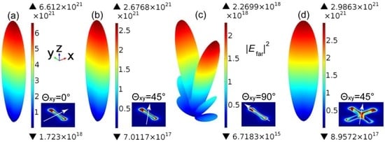 Previously, it was shown that the xz (or yz) plane of experimentally obtained volumetric radiation patterns of a bullseye structure, corresponds to the radiation pattern of a simulated 2D grating [] (see Chapters 8, 9 and Appendix A). To evaluate C1’s response vs. the change in µD in the xy plane, C1 was first modelled in 3D as a BE structure with a 250 nm long slit and later with a symmetric cross-shaped aperture having the same arm-lengths. The spherical simulation domain was divided by the planar structure into two hemispheres, with the bottom being the diamond substrate and the upper being the air. The first Fabry-Pérot resonance of the aperture in both cases occurs at t = 130 nm. To reduce the required computational resources, number of corrugations were limited to N = 3. All other dimensions were kept in accordance to the 2D model. A parametric sweep over the orientation of µD in the xy plane, Θxy, showed that RDREair ∝ |µA·ED|2 for the slit, as anticipated. RDREair in 3D was calculated using with integrations being carried over the surface s enclosing the hemisphere. The maximum RDREair obtained from the 3D model was calculated to be ~100 (results not shown here). Far-field intensities, |Efar|2 vs. Θxy also followed a similar trend with collimated beams being achieved for Θxy < 90°, Figure 6a–c. Far-field intensity emanating from the symmetric cross-shaped aperture, on the other hand, was impervious to the change in Θxy but the maximum far-field intensity in this case was almost half of that achieved by the slit, i.e., |Efar-cross|2/|Efar-slit|2 = 0.45 at their respective maxima. Presence of an additional arm in the cross-shape aperture reduces the nearby metallic surface area over which |ED|2 is projected on to, hence the reduction in absorption cross section of the acceptor.