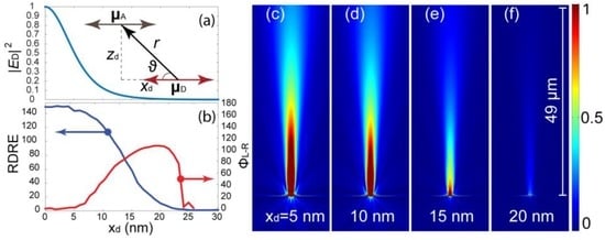 With the smallest spot size achievable by an Electron Beam Lithography (EBL) or a Focused Ion Beam (FIB) being as low as ~5 nm [,], fabrication of the aperture and the surrounding surface features poses no challenge. The resonance energy transfer between the donor and the acceptor, on the other hand, is sensitive to the changes in dipole’s position and orientation. The rest of the report, therefore, is dedicated to study such variations.