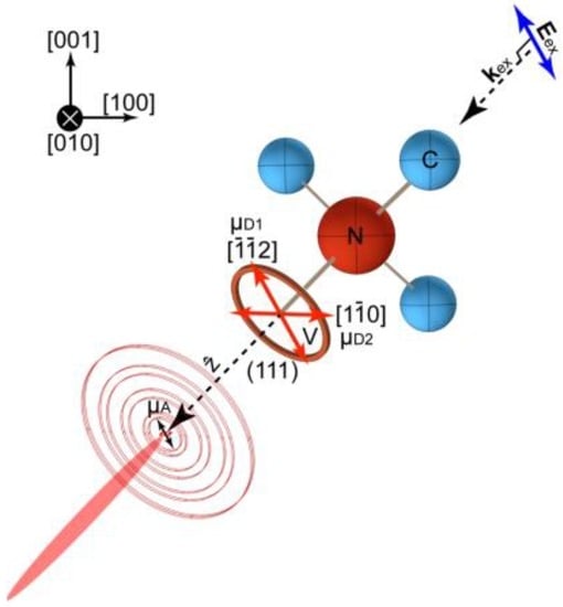 Best case scenario for implementing µA with respect to µD with z plane ‖ (111) (or z-axis being aligned with the symmetry axis of the NV-). There is no preferential direction for either Eex or µD since µD = α2µD1 + β2µD2, where α2 + β2 = 1.