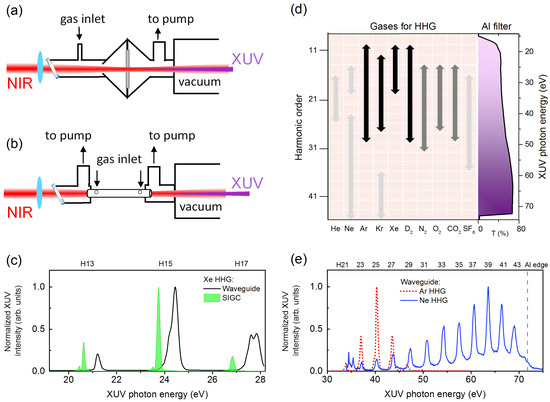 The XUV emission is in the form of odd harmonics due to the centro-symmetric nature of atomic gases, where the nth harmonic will have photon energy , where is the fundamental driving NIR frequency corresponding to the central wavelength in the range 778–788 nm. The use of molecular gases, however, can include weak ‘even’ harmonic emission as well. It should be mentioned that the reported XUV spectral ranges and the relative intensities are based on our femtosecond NIR pulse parameters, as well as our focusing and interaction geometry in the form of a waveguide or an SIGC. In general, the waveguide and the SIGC produce a similar HHG spectral profile. However, individual harmonics from a waveguide will have slightly higher photon energy, i.e., , where the blue shift is typically <0.5 eV, as shown in Figure 2c. The origin of blue shift is the stronger plasma generation in the gas when using a waveguide, which changes the phase match conditions for HHG. In addition, from Figure 2c, we can observe that each individual harmonic from the waveguide has a broader bandwidth compared to that from a SIGC. As for the spectral intensity, the HHG from a SIGC usually has stronger peak intensity comparing to that from a waveguide, and this is due to the coupling losses in a waveguide based HHG. The mechanisms behind the spectral range tuning of XUV emission from various gases in a waveguide or an SIGC can be attributed to the detailed phase matching considerations, which is beyond the scope of this paper. Detailed discussion of HHG phase match conditions can be found in Refs. [17,20,21].