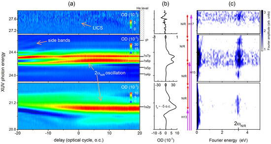 Note that, from the spectrogram in Figure 3, we can also observe very weak signal at around 27.7 eV. In this energy range, there are no known energy levels, or autoionizing states, embedded in helium continuum, so it should show featureless continuum absorption. On the contrary, we observe features in this range that can be attributed to the so-called laser-induced continuum structure (LICS). This effect was first discussed in the 1970s [25,26], and it has been reviewed in Ref. [27]. The subcycle oscillation in LICS is due to two pathways of photoexcitation, where one is excitation directly from ground state by H17 and the other is the promotion of an electron from 1snp state polarization with two NIR photons. As a result, we can again observe quantum beat signal in Fourier analysis similar to 2 oscillation in the case of 1s2p and 1snp polarizations.