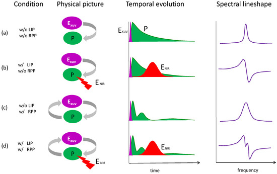 Most experiments in recent years assume single-atom response in their transient absorption experiments. However, the experimental densities in these experiments often approach a limit where the simple Beer-Lambert law is no longer valid and macroscopic effects should be taken into account. We have explored this regime in our recent studies [14,28], where we show that the collective macroscopic XUV pulse propagation effect, also called the resonant pulse propagation (RPP) effect, should be considered. We also laid out the criteria for consideration of gas target as an optically thick medium. Here, we provide a simple overview of the complex interplay between LIP effect and RPP effect by summarizing it in a schematic of Figure 4. The first column indicates experimental conditions, and the second column is the physical picture of the interaction, followed by its temporal description on the third column, and its corresponding spectral profile in the last column. In single-atom response picture—as explained in Section 3 and shown in Figure 4a—when XUV pulse alone (E) excites the dipole polarization (P) of a resonant medium, the Fourier transform of this oscillating and decaying polarization shows a Lorentzian spectrum in the frequency domain. The introduction of strong, time delayed NIR pulse (E) (Figure 4b) imparts an additional phase on the polarization, and this LIP effect results in a Fano spectral line shape. When an XUV propagation alone in a dense medium is considered (Figure 4c), the polarization created by the incident XUV is strong enough to radiate XUV light, and this emission could further excite secondary polarization. In this self-consistent dipole-field interaction picture, the final polarization will be temporally reshaped and it can be described by a Bessel function of the first kind (J) [29] as , where Γ is the decay lifetime, P is the gas pressure, and z is the propagation distance. Therefore, the pressure-length product determines the reshaping of XUV pulse in a dense resonant medium. The temporal reshaping manifests as broadened spectral lineshape. An important feature of the reshaped XUV pulse profile is that the first sub-pulse will be out-of-phase compared to the original pulse, the second sub-pulse will be out of phase compared to the first sub-pulse, and so on. These temporal phase variations can be brought to light using the presence of delayed NIR pulse, where the NIR pulse samples the π phase jumps between sub-pulses, and the LIP effect serves to broaden the fine spectral structure associated with these phase jumps. The non-linear interplay between RPP and LIP can thus be clearly seen through the appearance of new spectral features in the experimental transient absorption lineshape. It should be noted that, for this to happen, the duration of the first XUV sub-pulse has to be comparable or smaller than the NIR pulse duration, which means that pressure-length product has to be high enough to significantly reshape the XUV pulse through RPP effect.