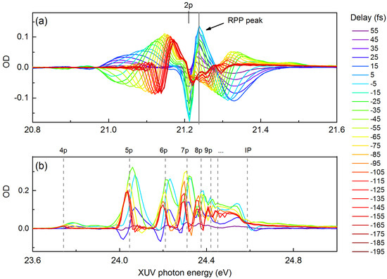 If we continue looking at the long wavelength (1428 nm) case and further increasing helium gas backing pressure to 1600 Pa, we can enhance the main RPP peak so that it becomes comparable or greater in strength than the original Fano profile peaks as seen in Figure 6a. Importantly, we can observe that, as the time delay is varied, the RPP strength changes monotonically; however, the dispersive Fano profile around the RPP peak changes its nature quite dramatically and going to positive to negative time delay results in complete reversal of the signal of OD. As for 1snp states in helium, including n = 4, 5, 6, 7,… to ionization potential (IP), the transition strength is much smaller, and hence the RPP effect is not very significant; therefore, most states show Fano-like profiles even with dense gas as shown in Figure 6b. Note that vertical gray dash lines are field-free energy level, and the ’real’ 1s2p and 1snp state under strong field dressing will be pondermotively shifted toward higher energy as shown in Ref. [30].