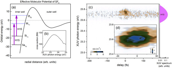 The absolute photoabsorption cross section in XUV range has been measured by Holland et al. [41] using a synchrotron source and is shown in Figure 7b. The H15 excites one of the most intense features in the inner well peaked around 23.5 eV, which could be attributed to two shape resonance enhanced inter-valence transitions [42,43]. The first one is 5a → 6t, which is correlated with the 3s and 3p orbitals, and the second one is 5t → 2t, which arises from the fluorine 2pπ orbitals and the sulfur 3d orbitals, respectively [37]. These two possible photoexcitation pathways are indicated by purple arrows in Figure 7a. However, it was suggested based on ab initio calculation that the first transition, 5a → 6t, is expected to be much stronger in its oscillator strength [37,44].