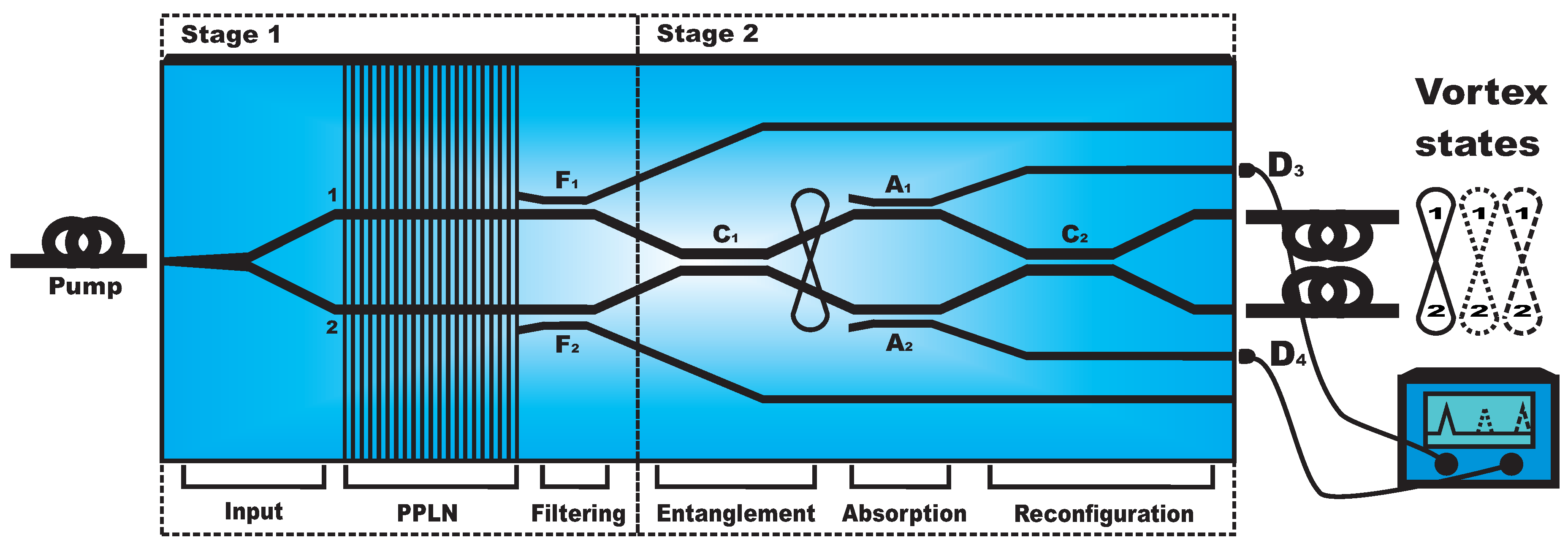 The first stage is composed by an integrated taper, where a slow transition between single- and two-mode parts of the input waveguide is designed in order to maximize the coupling of an input coherent field to the following symmetric splitter. The power of the pump is halved, and these two pumps propagating within waveguides 1 and 2 cross two areas specially engineered in order to maximize the nonlinear effect of the substrate. A large conversion efficiency between the pump and the daughter fields is obtained by tailoring the nonlinearity of the material by periodically poling (PPLN), enabling quasi-phase matching of the propagation constants (QPM) [