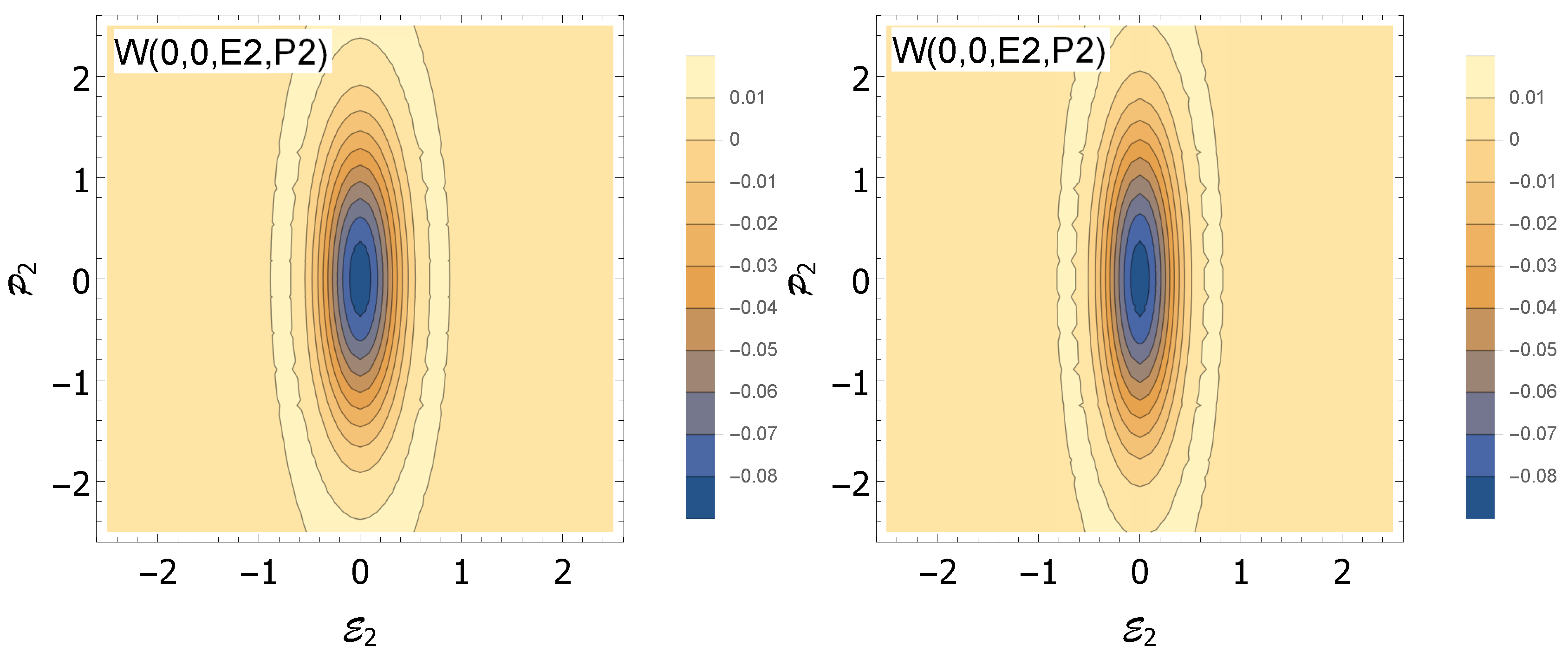 Figure 6 shows a good agreement between both Wigner functions in the area surrounding the origin of the phase space. However, higher order vortex terms should be added in order to get a better fit in the areas far from it.