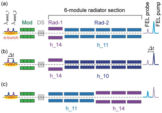 - Allaria, E.; Bencivenga, F.; Borghes, R.; Capotondi, F.; Castronovo, D.; Charalambous, P.; Cinquegrana, P.; Danailov, M.B.; de Ninno, G.; Demidovich, A.; et al. Two-colour pump–probe experiments with a twin-pulse-seed extreme ultraviolet free-electron laser. Nat. Commun. 2013, 4, 2476. [Google Scholar] [CrossRef] [PubMed]