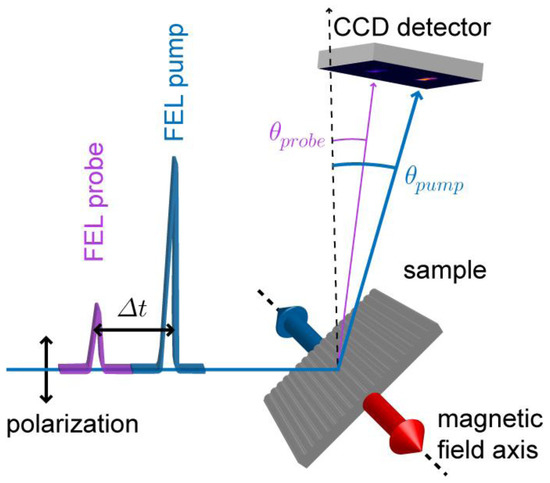 Schematics of the scattering measurement setup. The grating samples are mounted in a reflectometer featuring a vertical scattering plane. A magnetic field (up to 1.5 kOe pulsed, 500 Oe permanent) can be applied normal to the scattering plane and parallel to the sample surface by a horseshoe electromagnet. The FEL pulses with linear vertical polarization impinge on the sample grating at 46.5° and are diffracted at different angles according to their wavelengths. Diffracted intensities from the pump and probe FEL pulses are collected simultaneously by using a two-dimensional charge-coupled device detector.