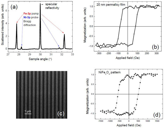 We measured two samples. The first is a 20 nm permalloy (Py) film, deposited on a 605 nm period Si grating and protected by a 3 nm Al capping layer (Figure 3a, FEL data). Its magnetic properties were characterized by MOKE using an optical laser (Figure 3b). The second is a 12.5 nm thick Ni-ferrite (NiFe2O4) layer grown epitaxially on MgAl2O4(001) [28]. A 100 × 400 µm2 area of the layer was ruled by focused ion beam (FIB) etching into a set of ~350 nm wide stripes with a ~600 nm period (Figure 3c). Magnetization curves showed a coercive field of ~500 Oe with >80% remanence (Figure 3d, FEL data). It is worth stressing that the fraction of pump energy absorbed in the Ni-ferrite sample is the same (~78% for the 12.5 nm thick film at 46.5° incidence) for both resonant (22.3 nm) and non-resonant (25.5 nm) pump wavelengths.