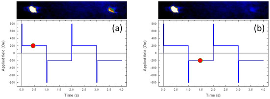 Data acquisition sequence. Sketch of the acquisition sequence used for determining the magnetic signal. (a) After a +800 Oe pulse of ~10 ms duration, data are collected in a +200 Oe applied field; (b) Same as (a), for negative field values. The magnetic signal is defined as the difference divided by the sum of the signals measured for opposite magnetization directions. Top panels: CCD images of the pump (left spot) and probe (right spot) scattered intensities.