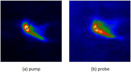 A reliable analysis of the demagnetization in a pump-probe experiment requires the sample to be homogeneously pumped over the probed area. From the images in Figure 4 and Figure 5, it is apparent that this is not the case if one integrates the scattered probe signal over the entire diffraction spot, since both the pump and the probe have an inhomogeneous spatial distribution of the intensity. In order to avoid averaging the probe signal over areas that are pumped differently, the magnetic signal reported in the following corresponds to the probe intensity scattered within a detector portion of 7 × 7 pixels (Figure 5) that measures the homogeneously pumped area.