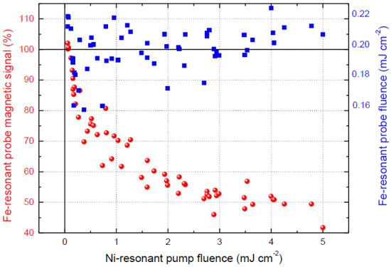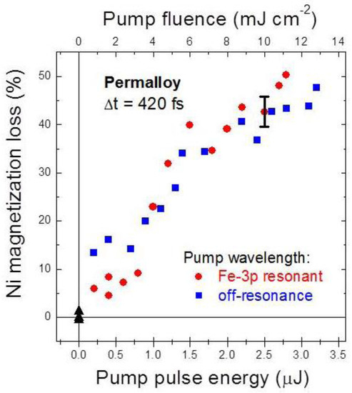 Figure 6 shows the dependence of the Ni magnetic signal on the pump fluence at a probe delay of 420 fs in Py. The pump fluence at the sample (F, top scale in Figure 6, in mJ·cm−2) is obtained by correcting the pump energy measured at the exit of the FEL source (bottom scale in Figure 6, in µJ) for the transport line transmission (a factor of 0.4, accounting for six reflections and a 200 nm Al filter), for the focal spot size (~80 µm), and for the angle of incidence (46.5°). The Ni magnetic signal is the asymmetry ratio in the Bragg peak intensity, i.e., the difference between the scattered intensities for opposite signs of the saturation magnetization direction, divided by their sum (see Figure 4). Figure 6 shows the loss in Ni magnetic signal with respect to the static value measured without the pump. The red and blue dots refer to the Fe-3p resonant (23.2 nm) and non-resonant (25.5 nm) pumping, respectively. The results do not evidence any clear dependence on the pump wavelength; both curves show the same trend of the Ni demagnetization with F, attaining a ~50% reduction at 10 mJ·cm−2.