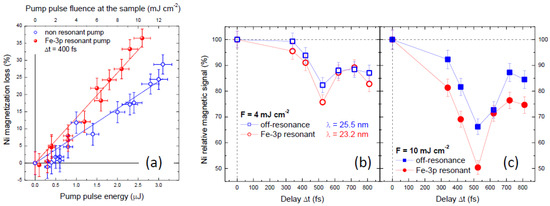 Figure 7a shows the Ni magnetization loss after 400 fs as a function of F. There is a clear difference between the data obtained using a non-resonant (blue dots) and an Fe-3p resonant (red dots) pump pulse, showing the influence of the pump wavelength on the Ni demagnetization. This sensitivity of the Ni-ferrite sample to the Fe-3p resonant and off-resonant pumping is also confirmed by the results obtained as a function of the pump-probe delay reported in Figure 7b,c. Dependence on the pump wavelength is observed already at the lower fluence F = 4 mJ·cm−2 (Figure 7b), and it becomes much more evident and well beyond experimental uncertainty at F = 10 mJ·cm−2 (Figure 7c). Figure 7b,c shows that for both F values, the quenching of the Ni magnetization is initially rather slow and reaches a maximum after ~500 fs.