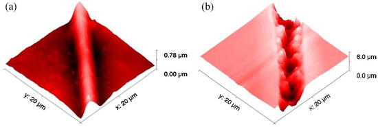 Sample topography from Atomic Force Microscopy (AFM) of structures induced on MEH-PPV film by using laser pulse energy of 0.6 nJ (a) and 1.1 nJ (b) at scanning speed of 25 μm/s. Reprinted with permission from [56]. Copyright (2014) Elsevier.