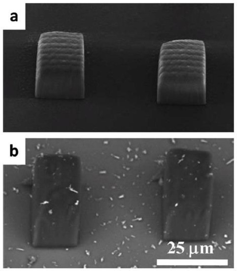 Femtosecond laser has also been applied to produce active microstructures via two-photon absorption polymerization (2PP). This technique enables the fabrication of neat and doped polymeric microstructures with high definition and virtually no shape constraints, finding application in optical, electrical and biological devices [59,60,61,62,63,64]. For instance, [65] the fabrication of three-dimensional microstructures based on triacrylate monomers and ZnO nanowires using a fs-laser experimental setup delivering pulse energies of 0.5 nJ has been reported. The fabricated composite microstructures containing 1% of ZnO dispersed in the polymeric matrix displayed good structural integrity, as can be seen in the scanning electron microscopy (SEM) images displayed in Figure 5.