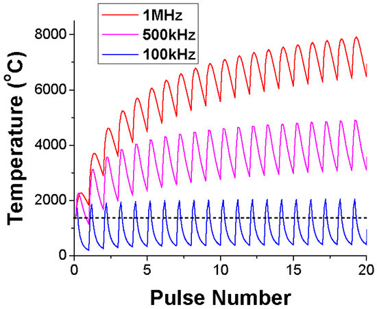 Even though femtosecond lasers are known for avoiding thermal effects in material processing, elevated repetition rates can make it considerable. Figure 11 illustrates the effect of repetition rate on the temperature during waveguide fabrication in alkali-free borosilicate. The irradiation condition (λ = 1045 nm, 375 fs, NA = 0.65) was used in the finite-difference thermal diffusion model, and a delta function in time was applied as the heat source, because the timescale for electron heating and electron-phonon coupling (<1 ps) is much shorter than the thermal diffusion time (>0.1 µs), according to the literature [100]. As one can see, for a repetition rate of 100 kHz, the temperature oscillates below and just above the working point of the glass (dashed line) each time a laser pulse achieves the network. For higher repetition rates, 0.5 and 1 MHz, there is a fast and significant increase of the temperature with the number of laser pulses, which keeps rising slowly with additional pulses. Thus, considering the time interval between consecutive pulses, the temperature behavior can be split into two regimes: (1) at low repetition rates, the thermal effects are repetitive and minimized because the heating follows the energy deposition by the laser pulses; and (2) at high repetition rates, there is not enough time for the lattice to cool down before the next pulse, resulting in heat accumulation and further increase of the temperature. Some researchers [105] found that the threshold between repetitive and cumulative effects is around 200 kHz for alkali-free borosilicate and low-alkali boroaluminosilicate glasses [100]. Conversely, Schaffer et al. obtained 1 MHz for a zinc-doped borosilicate glass, but they employed lower pulse energy and tighter focusing [106]. It is worth pointing out that there is a strong dependence on the experimental conditions and waveguide features. In general, the cumulative heating effect is favored by high pulse energy, high repetition rate and short wavelength that facilitate nonlinear interactions.