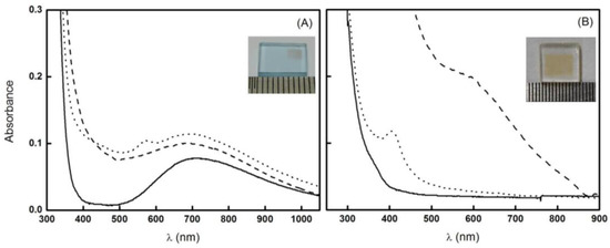 It is important to emphasize that the fs-laser is fundamental for the nucleation process, while the growth is achieved by some heating stage. Thus, if low repetition rate lasers are applied, annealing is required, configuring a two-step processing. Figure 12 clarifies the effects of high and low repetition rate lasers on the precipitation of copper and silver NPs in borosilicate glass [107,109]. The absorption spectra of pristine samples are represented by solid curve, while dotted and dashed curves display the absorbance after the irradiation using fs-lasers of 5 MHz (800 nm, 50 fs) and 1 kHz (775 nm, 150 fs) of repetition rate, respectively. Details about sample composition and experimental setup are described in Refs. [107,109].