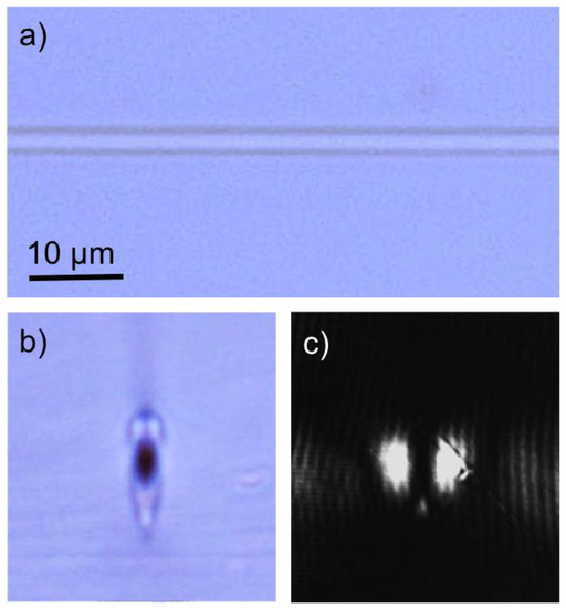 Optical microscopy images of the waveguide fabricated by fs-laser direct writing micromachining in silver-doped tungsten lead-pyrophosphate glass. Figures (a,b) show the top and end views respectively, while (c) displays the near-field output profile of the light guided at 632.8 nm. The scale bar for (b,c) is the same of (a). Reprinted with permission from [36]. Copyright (2014), AIP Publishing LLC.