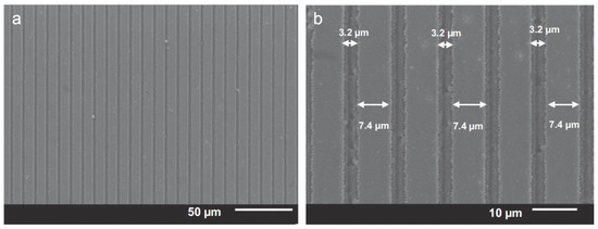 Fs-laser processing can also be used to fabricate interdigitated electrodes (IDEs) in metals for analytical chemical sensors, such as electronic tongues (e-tongue) [121,122,123,124] with high definition and accuracy. An interesting study on laser-induced heating, melting and ablation of metals, specifically aluminum, with a fundamental approach, has been recently published in Ref. [125]. In respect to IDEs, Manzolli et al. [126] reported the use of fs-laser-induced ablation for such a purpose. For that, glass substrate hosting a deposited bilayer film of chromium and gold with a thickness of 5 nm and 100 nm, respectively, were used as samples to be micromachined by a Ti:sapphire laser oscillator that emitted 50 fs pulses with energy up to 100 nJ at a repetition rate of 5.2 MHz. The samples were mounted in a motorized xy stage computer-controlled and positioned at the focus of a microscope objective, and parameters such as scanning velocity, objective numerical aperture and pulse energy were optimized. Analysis from optical and scanning electron microscopy showed that the coating material removal was uniform, accurate and continuous during the ablation process. Optimal experimental parameters included scanning velocity of 20 µm/s and pulse energy of 70 nJ focused by an objective of ×40 (NA = 0.65), which yielded 3.2 µm-wide fingers separated by a gap distance of 7.4 µm, according to scanning electron microscopy (SEM) images shown in Figure 14. Micromachining using higher pulse energies showed less control of the features fabricated, since with approximately 200 ns of pulse separation the heat accumulation became relevant. Novel techniques have also been developed in order to achieve higher resolution and control in nanowire fabrication. For example, Wang et al. added a spatial light modulator in the micromachining setup to overcome the diffraction limit and produce gold wires at nanoscale [127].