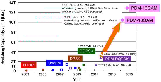 Previously, extensive research has been carried out in our group on OPS-related subsystems. Our OPS node architecture has an all-optical data plane that is made of optical switches and fiber delay lines (FDLs). Owing to the optical switch transparency, optical packets with different data rates and high-order modulation formats can be handled without changing the OPS node architecture. Figure 1 shows an evolution of the OPS node capacity per port over time. Employing differential quaternary shift keying (DQPSK) modulated, fixed length, colored optical packets over 64 wavelength channels and a (Pb,La)(Zr,La)O3 (PLZT) [12] optical switch with packet buffering, a switching capacity of 1.28 Tb/s/port was demonstrated [13]. Using polarization division multiplexing (PDM)-DQPSK modulation format, we demonstrated a switching capacity of 1.28 Tb/s/port with 32 wavelength channels [14] and later 2.56 Tbit/s/port with 64 wavelength channels [15,16].