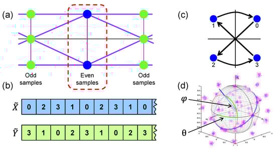 (a) Eye diagram for any of the tributary components of a PDM-QPSK signal, sampled at two samples-per-symbol; (b) format of the optical packet header. Each number represents the transmitted constellation symbol on each symbol period; (c) QPSK constellation diagram showing the constellation symbol mapping; and (d) example of the lens-shaped object for PDM-16QAM and a polarization rotation.