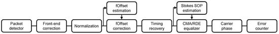 Figure 3 shows a diagram of the digital signal processing (DSP) blocks used in the proposed DCBMRX [17]. First, a packet detector detects when an incoming optical packet arrives to the receiver and triggers the execution of the subsequent receiver stages [36]. Note that, in this work, this packet detector was not implemented and perfect packet detection was emulated with knowledge of the pattern timing from the transmitter. After the packet detector, a front-end correction and resampling stage corrects for channel skew and resamples the captured signal to four samples-per-symbol or the Nyquist rate of two samples-per-symbol. Then, the signal is normalized and the carrier frequency offset estimated and compensated by means of a fast Fourier transform (FFT). After the frequency offset has been removed, samples are aligned in a clock recovery stage using the Lee algorithm for two samples-per-symbol signals [37] or the Oerder algorithm for four samples-per-symbol signals [38]. Note that Nyquist shaped signals with small roll-off factor may require custom algorithms for clock recovery [39]. Next, the SOP angles and are estimated using the proposed algorithm and its values used to initialize the CMA equalizer in case of receiving a PDM-QPSK modulation or a radially directed equalizer (RDE) for PDM-16QAM modulation. After equalization, the carrier phase is estimated with the Viterbi and Viterbi algorithm [40] or a set-partitioned Viterbi and Viterbi [41] for QPSK and 16QAM modulations, respectively. Finally, bit error rate (BER) is measured by error counting.