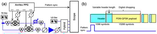 Figure 4b depicts a diagram of the generated optical packets used for the characterization of the burst-mode receiver. Each packet consisted of a header of 1096 symbols followed by a payload of 15,288 symbols. The pattern used on each payload binary tributary consisted of the first 15,288 bits of a pseudo-random binary sequence (PRBS) sequence of order 20 and the accumulated PRBS decorrelation between different tributaries was 262,144 bits. In the experimental setup of Figure 4a, no packet carver such as an acousto-optical modulator (AOM) or SOA was used. Instead, to simulate optical packets with a desired header length, the oscilloscope was triggered at the beginning of the pattern and then optical packets were digitally chopped with knowledge of the timing. The optical packet header consisted of two PDM tributaries, each repeating the constellation pattern shown in Figure 2b,c. This constellation has the property that the transitions to nullify optical power are maximized, which is beneficial for timing recovery. Furthermore, sufficient points in the Stokes space are generated for having an accurate estimation of the SOP.