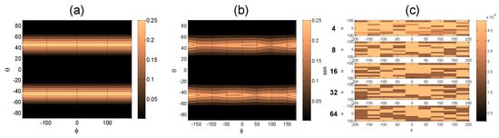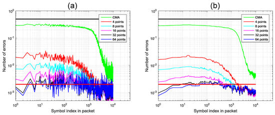 Note that the experimental setup of Figure 4a does not include a polarization scrambler to rotate the SOP of the optical packets before the receiver. Instead, a set of 128 packets having a known SOP were captured, and then the SOP was estimated using the whole of the optical packet in order to minimize the estimation errors, and the SOP was digitally corrected. Then, each packet was chopped to the desired header length and the SOP was digitally rotated using Equation (2) with in the range [–180°, 180°] and in the range of [–90°, 90°] to simulate any arbitrary SOP rotation state over the whole Poincaré sphere. Before the digital SOP rotation, synthetic AWGN, independent for every optical packet and every SOP rotation, was added to the signal in order to produce a payload BER of roughly 10−3.