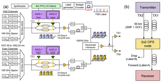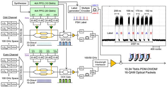 A train of eight packets of different lengths, ranging from 1000 to 4000 symbols, was generated and each packet had either a PSK label A or label B, as shown in the inset of Figure 7. For label generation, 10 GHz optical pulses generated by a mode-locked laser diode (MLLD, 1530 nm) were modulated using known timing from the coherent packets payload pattern by an intensity modulator. The pulses were input to a 200 Gchip/s multiple optical encoder (MOE) to generate optical phase-shift keying (PSK) codes. The MOE has an AWG configuration [42,43] with 16 inputs and 16 outputs, and behaves like a transversal filter to simultaneously generate 16-chip PSK codes. When a short pulse is sent into one of input ports of MOE, 16 different PSK codes are generated from each output port [43]. In this demonstration, two PSK codes were chosen and named label A and label B. After coupling of even and odd channels by a wavelength interleaver (100 GHz to 50 GHz), each packet was sandwiched by the PSK labels.