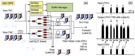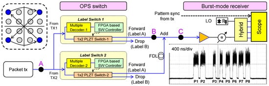 In this experiment, we used the same optical packet transmitter described in Section 3.1. After the transmitter, the eight-packet train was split in a 1 × 2 splitter to simulate two different transmitters named TX1 and TX2, and both TX1 and TX2 were input to the optical switching node, as shown in Figure 12. We reconfigured our 31-FDL buffering system, which consisted of nine 1 × 8 PLZT switches, fiber sheet delay lines (FSDLs) and an FPGA-based buffer manager, and made a 2 × 2 OPS node system where two PLZT switches were followed by three FSDLs. The unit delay time of each FSDL was 100 ns. One of three different delays {0, 100, 200} ns was given to the packet by changing an output port of the switch. In this demonstration, only packets with label A were processed and characterized. When the multiple optical decoders [42,43] recognized an input label as label A, gate signals output the optical packet to the buffer manager. The buffer manager can resolve a maximum contention of 4 × 1 packets.