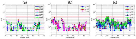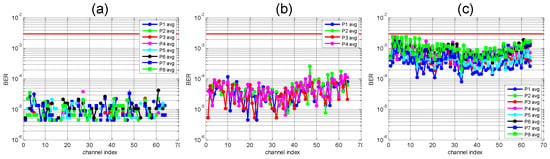 Figure 9a–c shows the bit-error-rate (BER) for the 64 wavelength channels after the transmitter (back-to-back, measured at point A on Figure 8), after label-switching (measured at point B) and after packet addition (measured at point C), respectively, for every individual packet P1 to P8 and each measurement averaged over three packets (best three of 10 experimental trials). Discontinuities in the plots arise from error-free measurements. The observed saw-tooth shape is due to uneven biasing of the inphase-quadrature (IQ) modulator between odd and even channels and also to modulator BIAS instabilities. These plots show that PDM-16QAM payload BER is below the FEC limit of 3 × 10−3. Moreover, the soft horizontal lines show the total BER averaged for all odd packets (cyan) and even packets (magenta), showing a very small BER penalty after label-switching. However, after the addition of packets, even packets in the packet train suffer an additional penalty due to increased DGD originating in the optical switch.